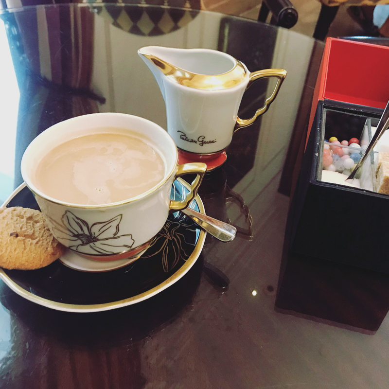 赤いベルベッドの椅子、シャンデリア、壁には歴史的な肖像画や写真が飾られており、まるで宮殿で珈琲を楽しんでいる気分になれます。
