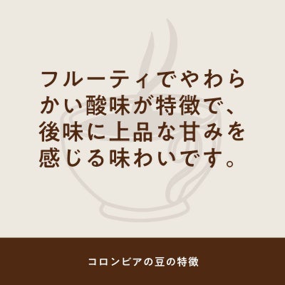 マイルドで豊かなコク、甘い香りと丸みのある酸味が特徴で、焙煎は、コロンビア豆の余韻が生きるように、ベストな煎りで仕上げています。