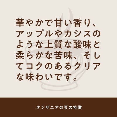 タンザニアの格付けグレード最上級「AA」の豆を使用しており、コクと酸味のコントラストが印象的でクリアな味わいです。ひと口ずつゆっくり味わい、ふわっと残る余韻を愉しみつつ、飲み終わるとまた何度でも味わいたくなる至福の一杯です。