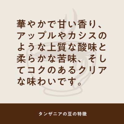 タンザニアの格付けグレード最上級「AA」の豆を使用しており、コクと酸味のコントラストが印象的でクリアな味わいです。ひと口ずつゆっくり味わい、ふわっと残る余韻を愉しみつつ、飲み終わるとまた何度でも味わいたくなる至福の一杯です。