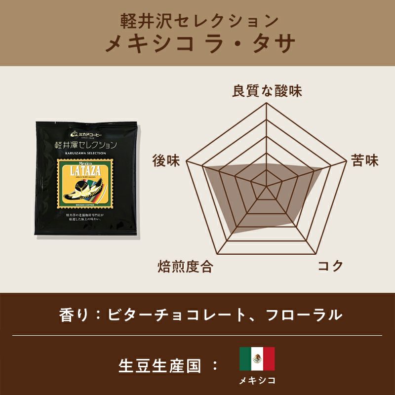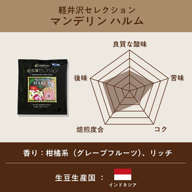 ワンランク上の贅沢な味わい軽井沢セレクション軽井沢セレクションは、ミカド珈琲の中でも特に良質な豆の個性を生かした味わいを楽しんで頂けるシリーズです。5種類全て楽しめるアソートパックもございます。