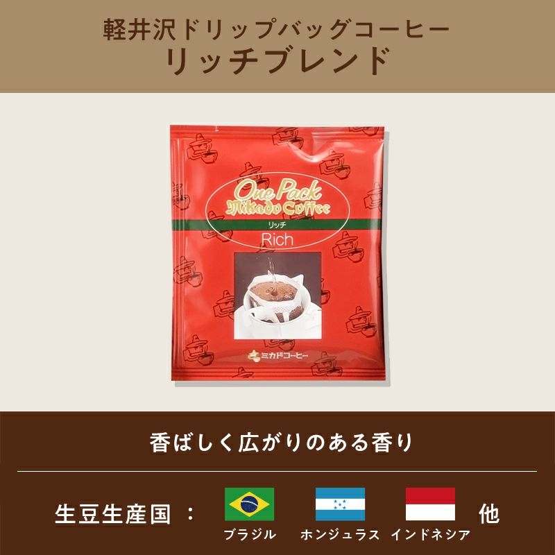 他の画像を見る 【冬ギフト2025】ドリップバッグコーヒーギフトマイルドブレンド【8枚】とリッチブレンド【8枚】OP-20〈各1枚:8g〉 クーポン対象 定価 ¥ 2,700 のところ 販売価格 ¥ 2,430 税込 販売期間 2025/11/22 0:01 〜 2025/12/21 23:59 ミカド珈琲の軽井沢土産の人気商品です。まろやかな味わいの【ドリップバッグコーヒー マイルドブレンド】と、深煎りのコクをプラスした【ドリップバッグコーヒー リッチブレンド】の2種類の味わいで、軽井沢の風をお届けします。 お気に入りに登録する