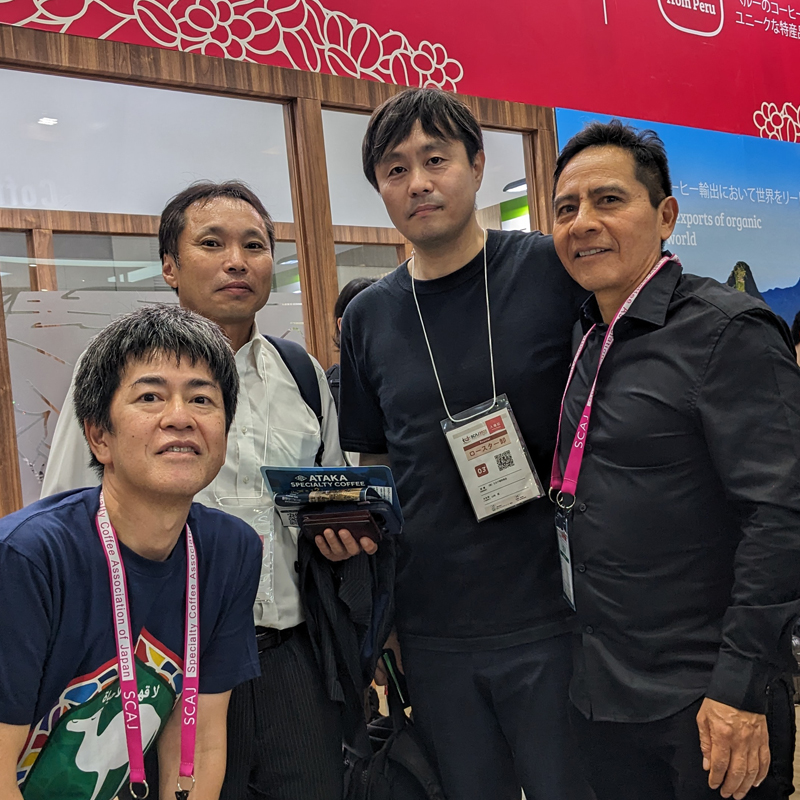SCAJ2025時、ペルーコーヒーブースにて、ペルーの農園の方、弊社焙煎チーム2名、輸入商社の方