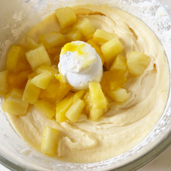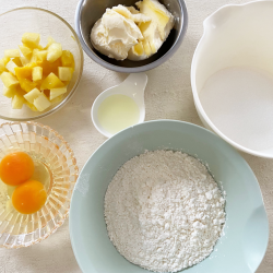 2. グラニュー糖 3 . 卵 4. 塩 5. レモン汁 6. レモンの皮 7. 薄力粉 8. ベーキングパウダー 9. パイナップル 10. マンゴー 11. ブルーベリー等 120g