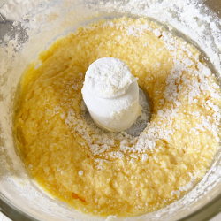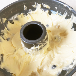 【下準備】 冷蔵庫から出したバターをフードプロセッサーに入れ、クリーム状になったら、グラニュー糖を3回に分けて入れ、塩も加えて混ぜる。 卵も1つづつ入れ、その都度混ぜて、レモン汁、皮も加えて混ぜる。 最後にフルーツも加え軽く混ぜる。 バターを塗った型に生地を入れて180度のオーブンで40~45分位焼く。オーブンによって多少の焼き時間は変わります。 |